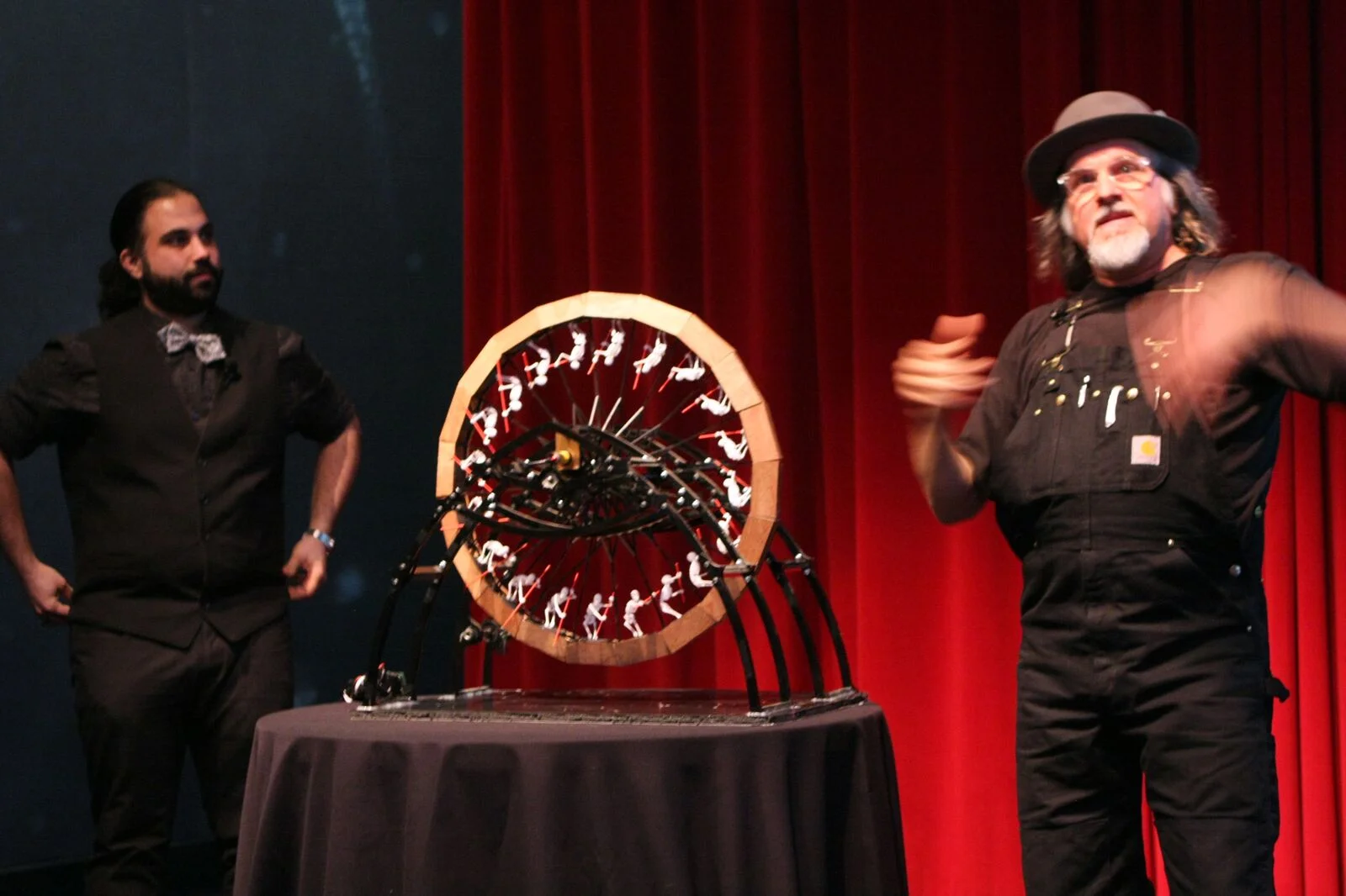 Zoetropes are the earliest form of animation dating back to the 1800s. They consist of a cylinder with a progression of images inside and slots to peer through. As the wheel spins, the motion gives the viewer the illusion of movement. Hudzo figured out a way to create the effect with life-sized sculptures, using spinning motion and strobe lights to create something akin to a three-dimensional motion picture. Hudzo is ready to share his magic with you...